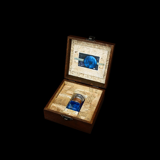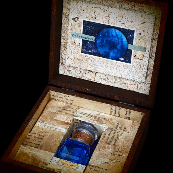 紙、古書紙片、蛍石、銅板、ガラス瓶、釘、木材、小箱