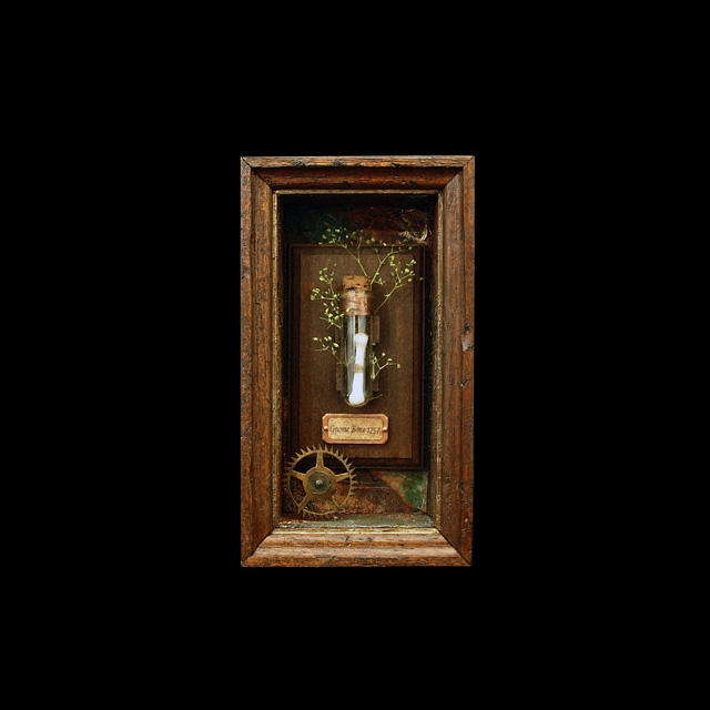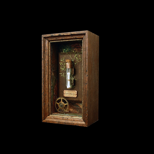 試験管、コルク、歯車、ドライフラワー、紙粘土、真鍮板、紙、アクリル板、木材
