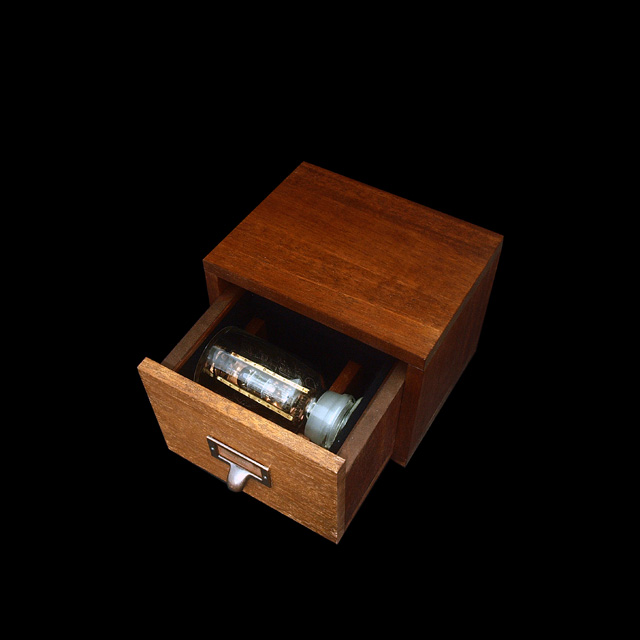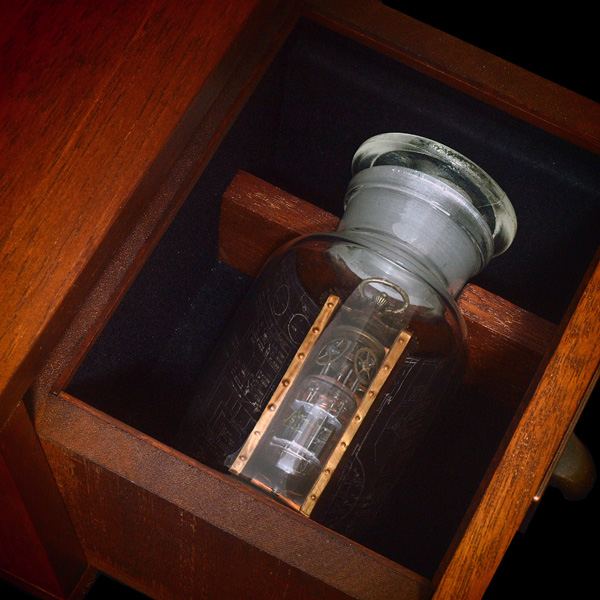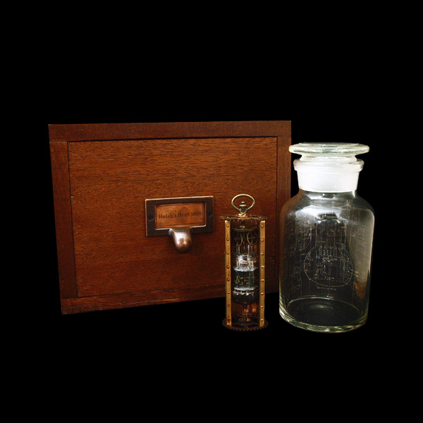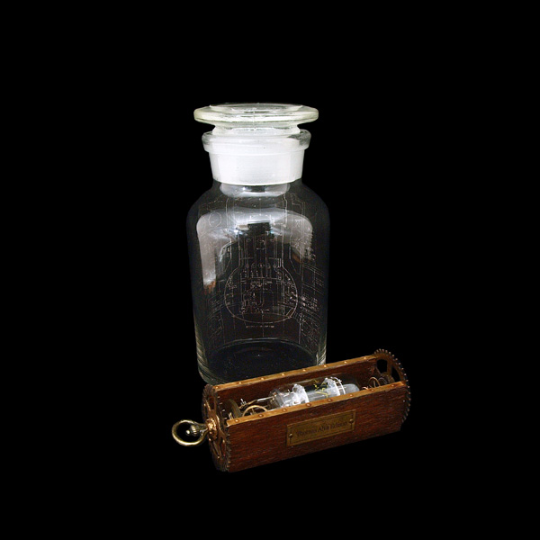 硝子瓶、歯車、時計パーツ、真空管、銅板、真鍮板、紙、木材