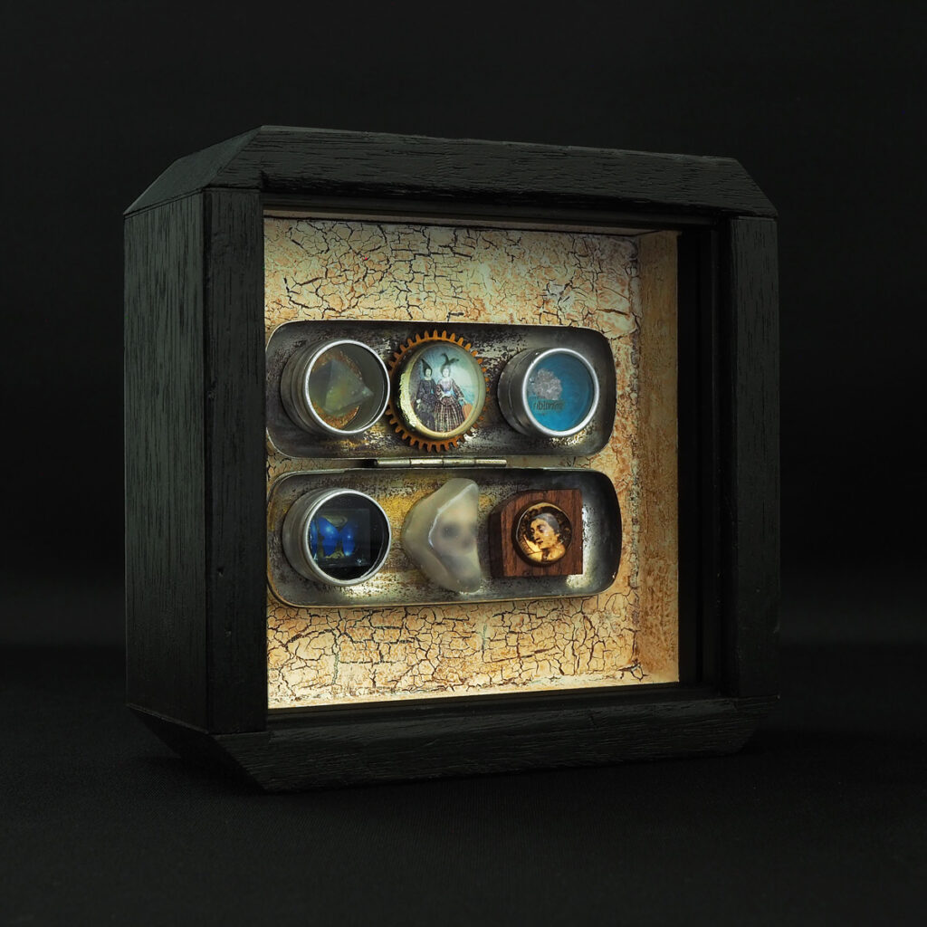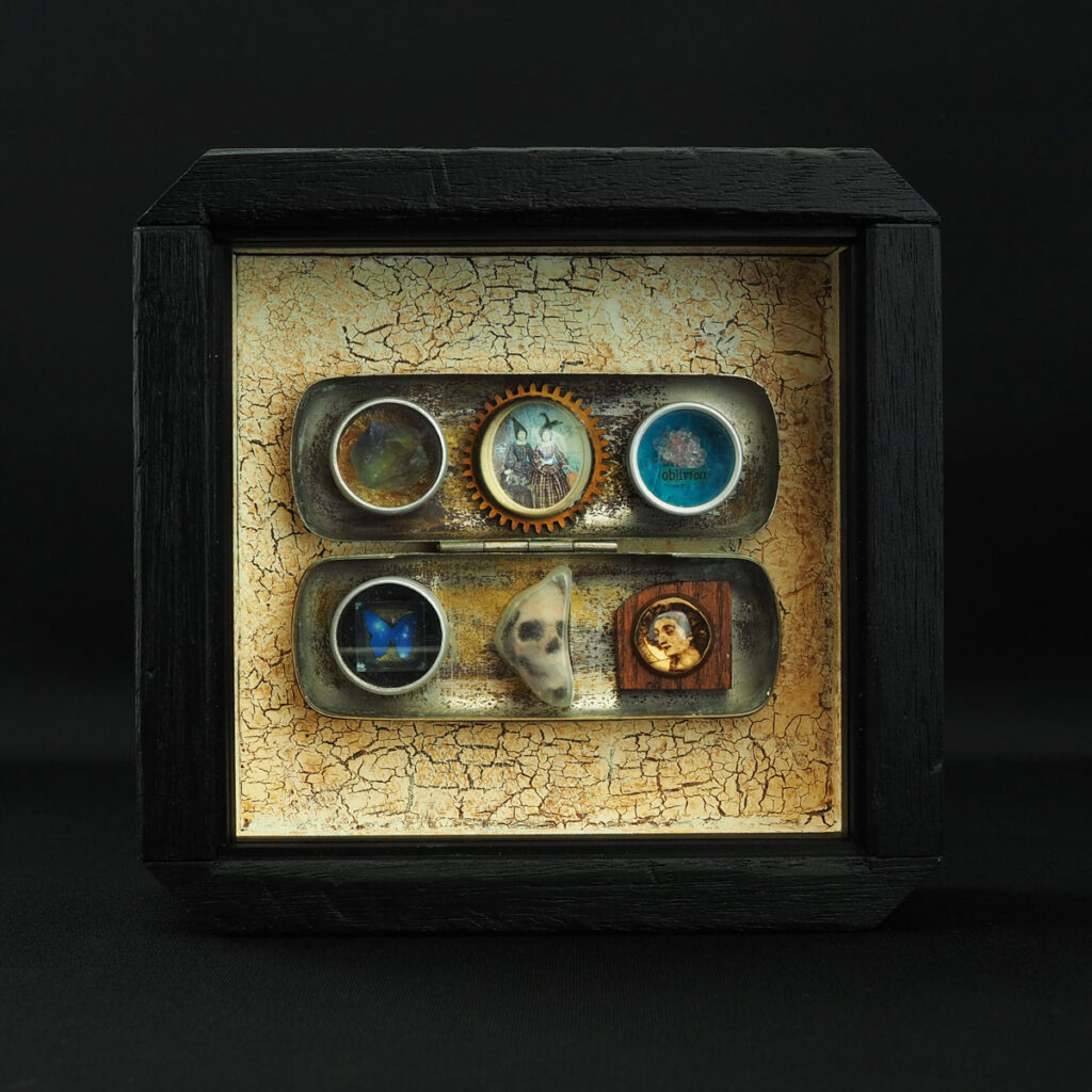 忘却の標本2022年 14.9×15.4×6.0cm・個人蔵[技法]デジタルプリント、コラージュ、アッサンブラージュ、鉛筆、水性塗料、アクリル絵具、樹脂造形、エイジング塗装、木工