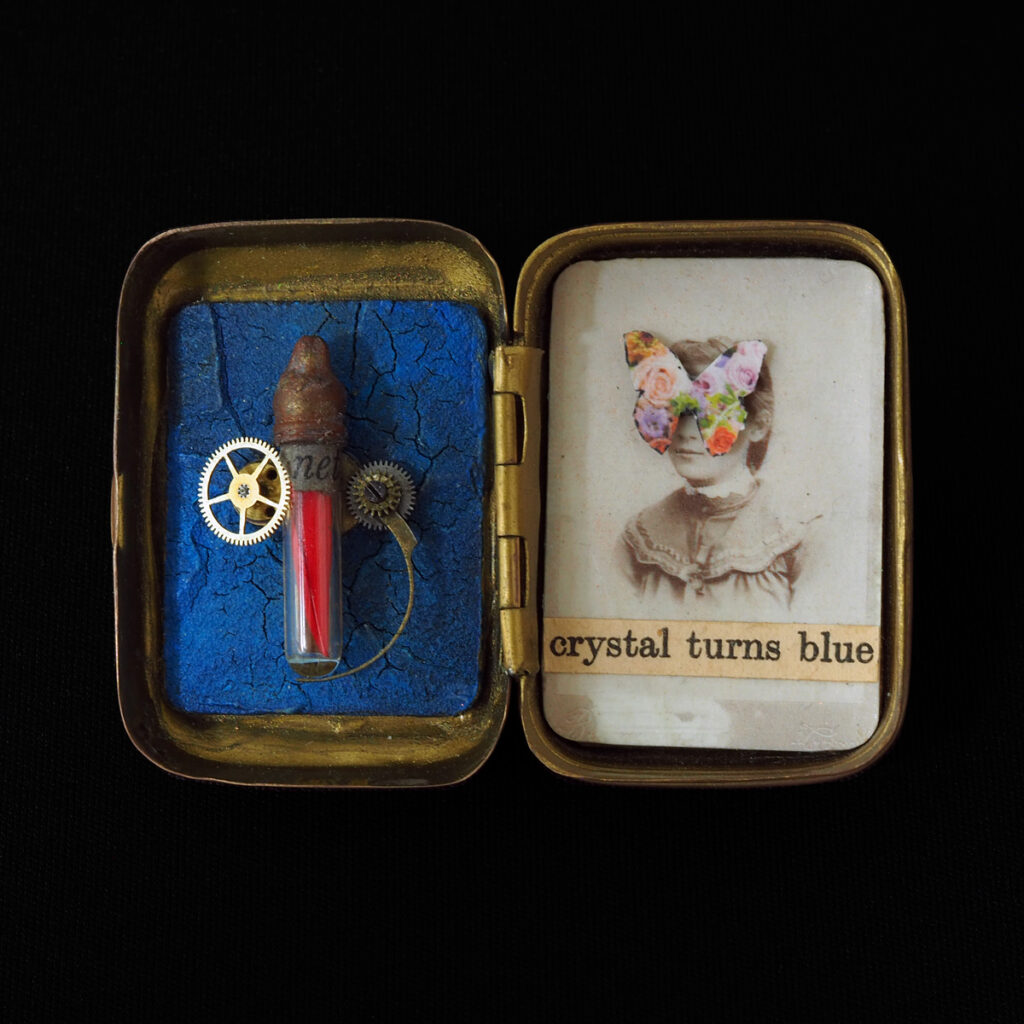 歯車、時計パーツ、羽根、古書紙片、紙、木材、金属ケース