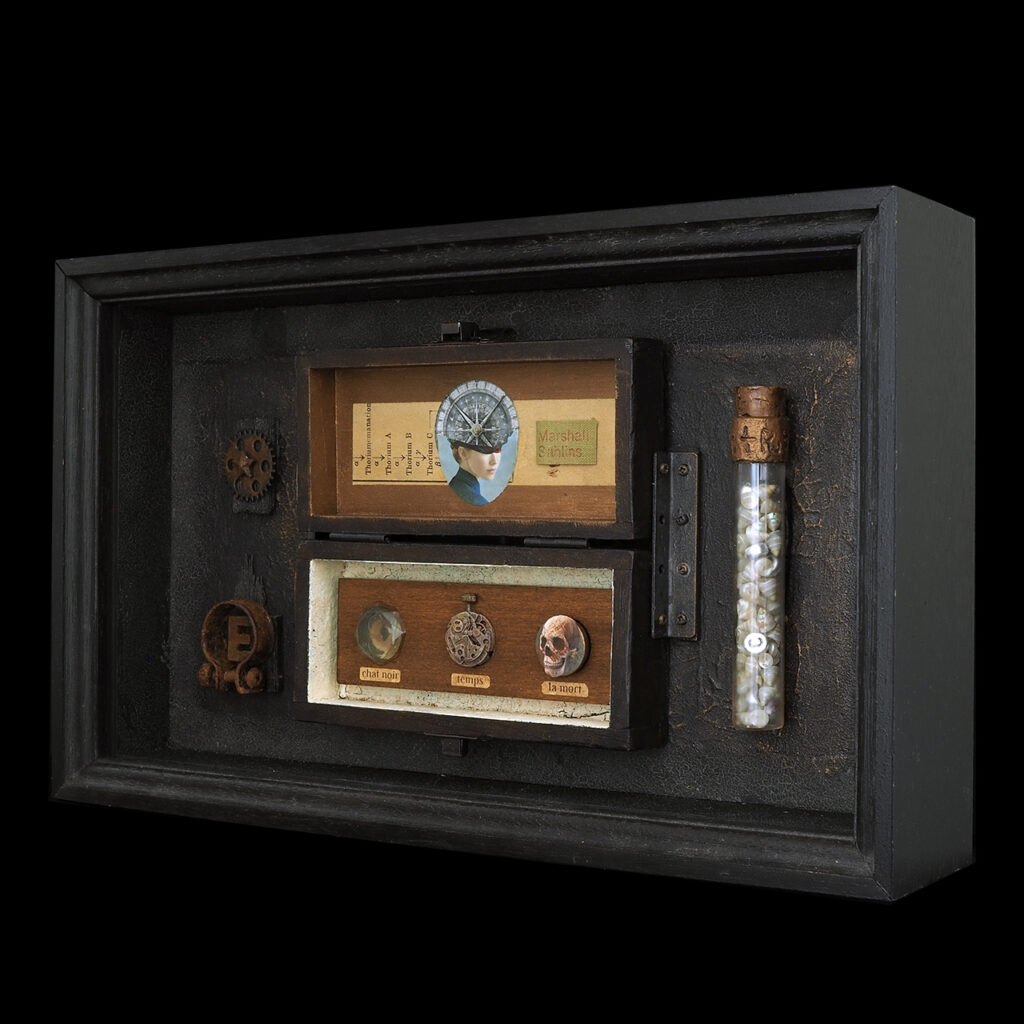 時計パーツ、コルク、貝殻、試験管、歯車、古書紙片、螺子、鉄、アクリル板、紙、木材