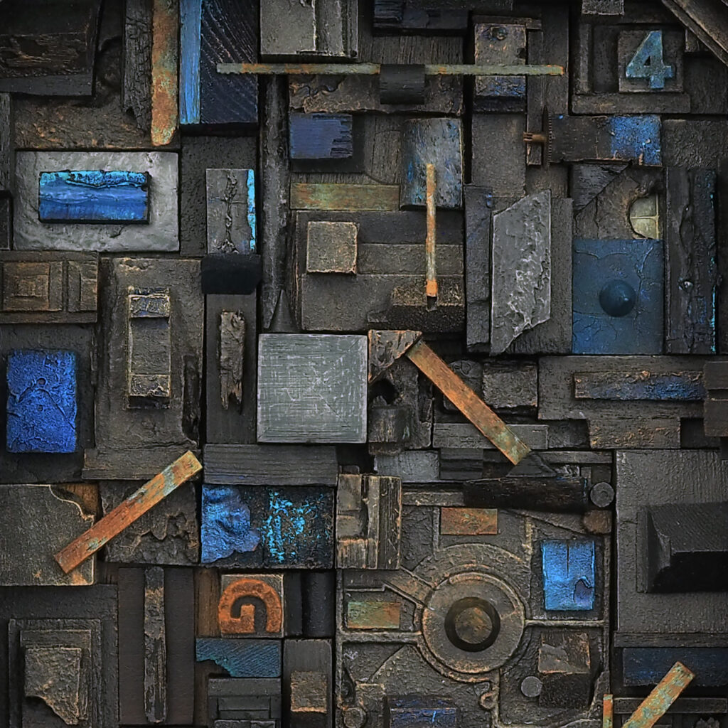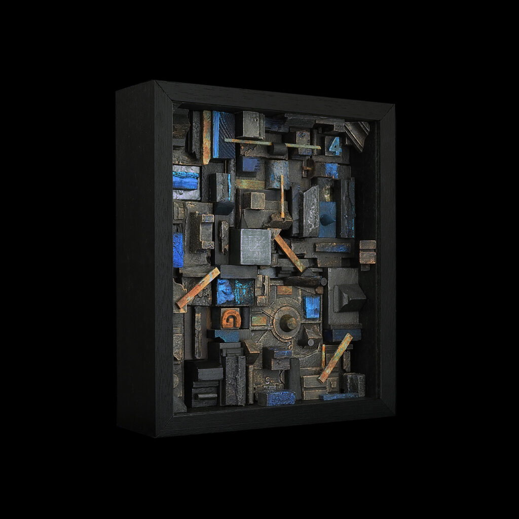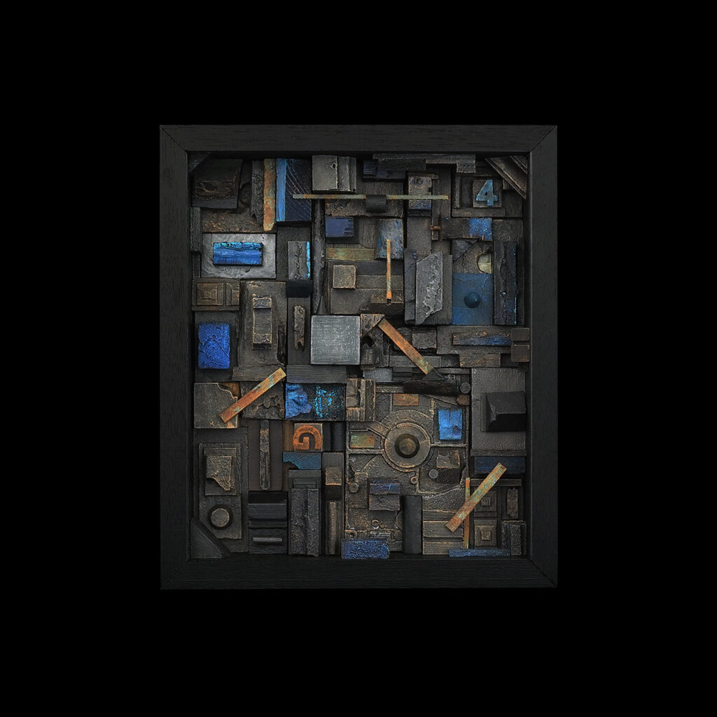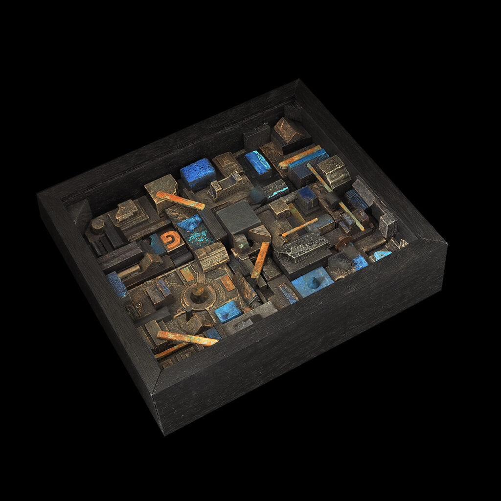 回路I / Circuit I 2026年 25×21.4×6cm[技法]コラージュ、アッサンブラージュ、水性塗料、アクリル絵具、樹脂造形、錆塗装、エイジング塗装、エイジング加工、木工[素材]紙、真鍮、鉄、樹脂、木材